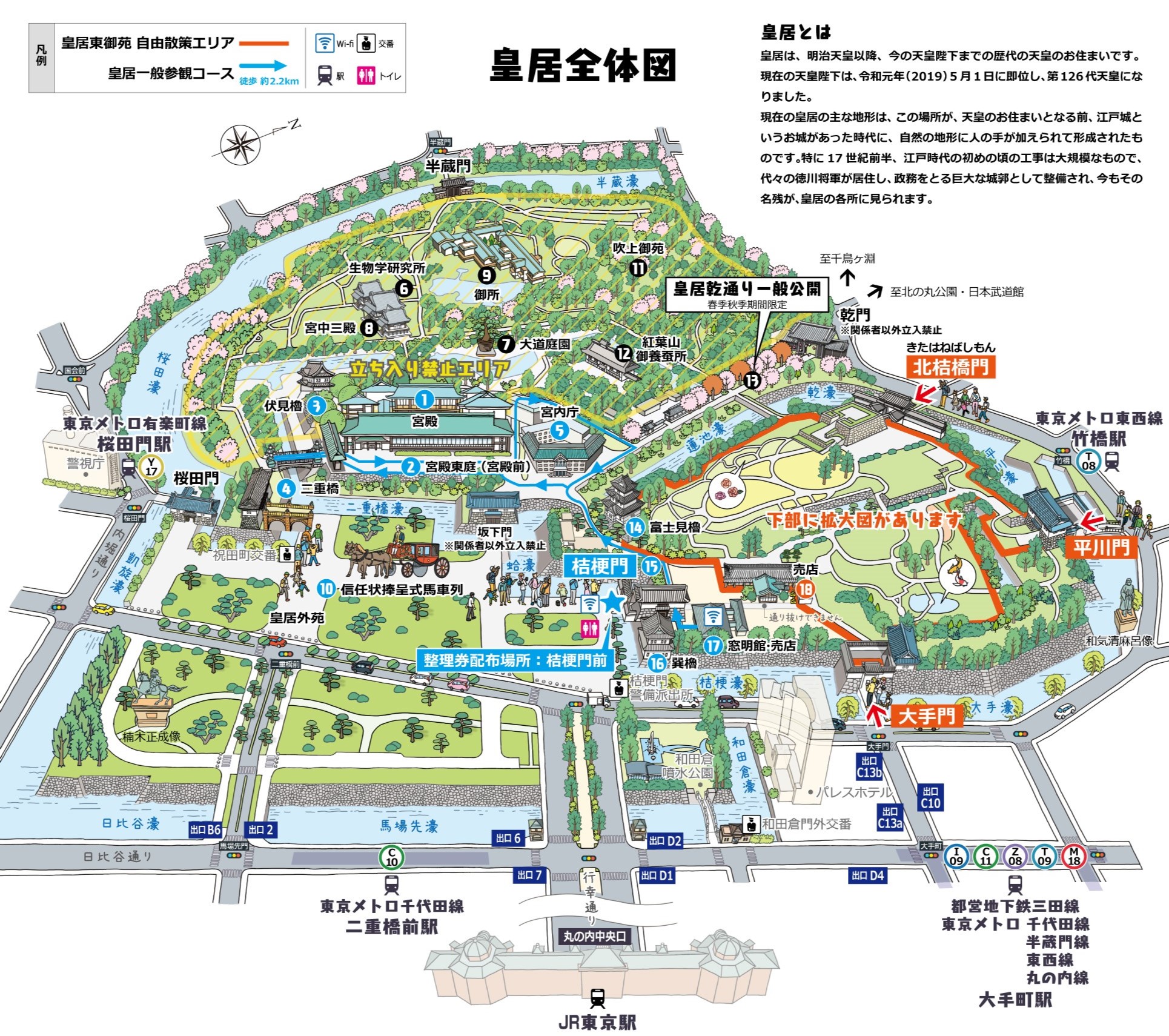 上記のように、複数の駅が皇居周辺にあり、行きたい門・入口によって最寄駅が変わります。